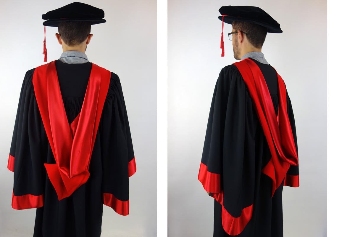 University of Melbourne PhD academic regalia consists of a black gown with red facings and cuffs. The Oxford style hood is made in red and fully lined in matching colour. The black velvet bonnet has a red cord and tassels.